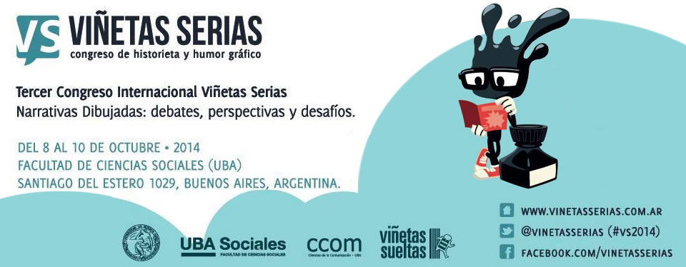 Viñetas Serias: "Congreso Internacional de Historietas Viñetas Serias. En la Universidad de Buenos Aires, Argentina. Este encuentro considera a la historieta como un capítulo de la historia y busca promover una experiencia que estimule la producción teórica y crítica en articulación con series más amplias de la cultura, la política y la sociedad. Dado que la historieta como objeto no ha ocupado un lugar destacado en las Ciencias Sociales, la propuesta es delinear puntos de partida entre las diversas tradiciones de investigación para consolidar un campo de estudios y una red de trabajo."